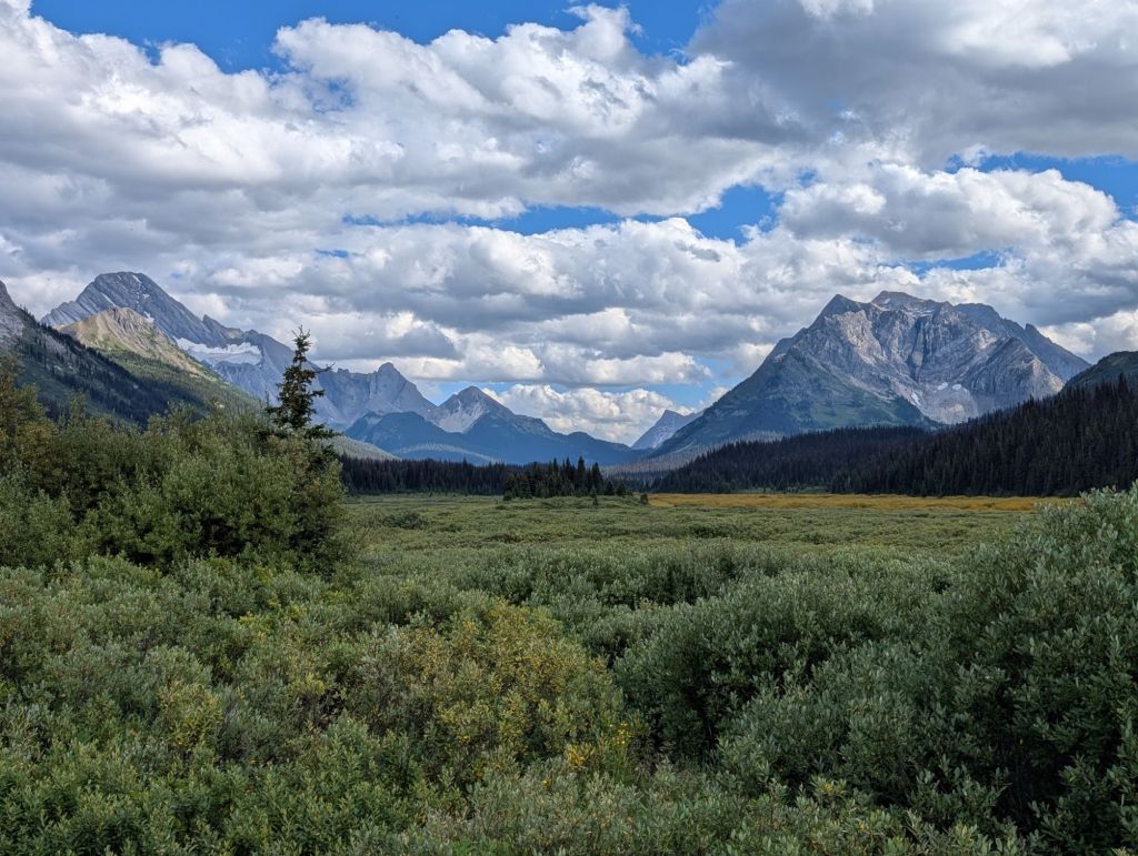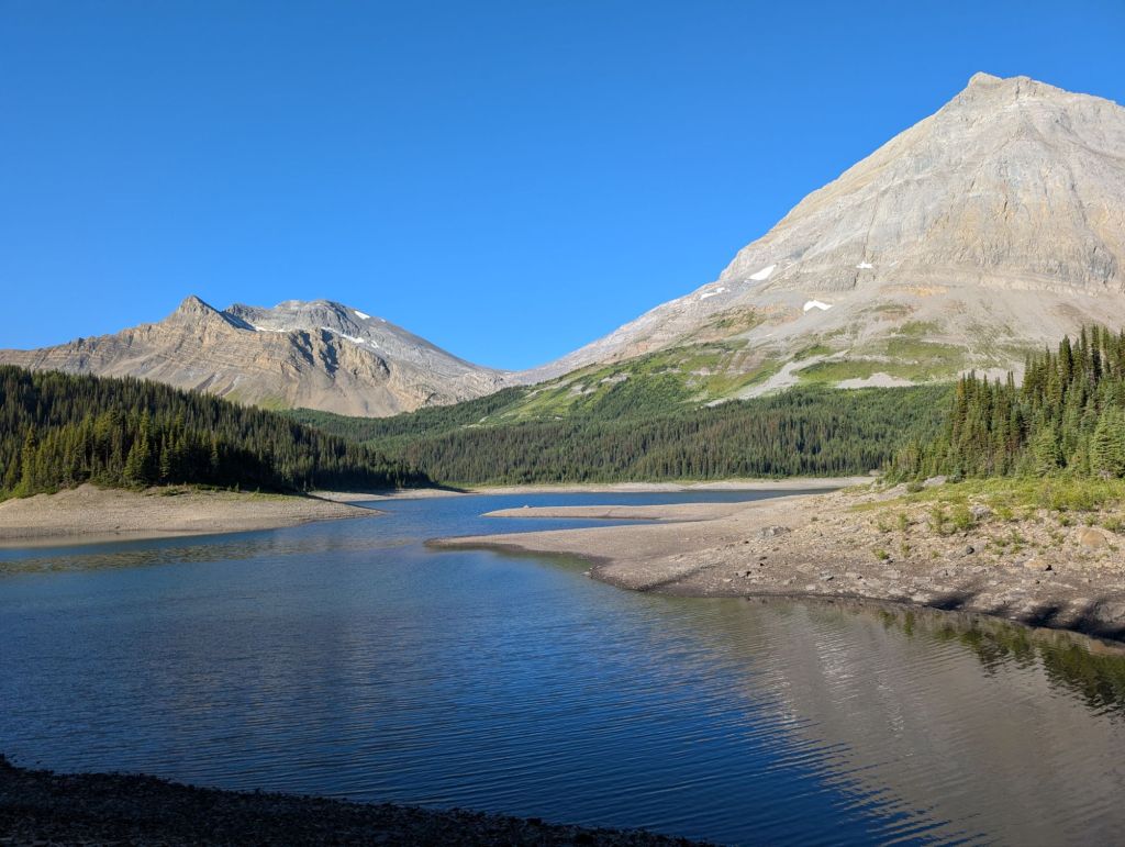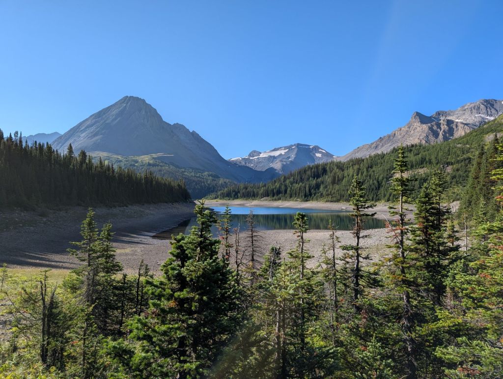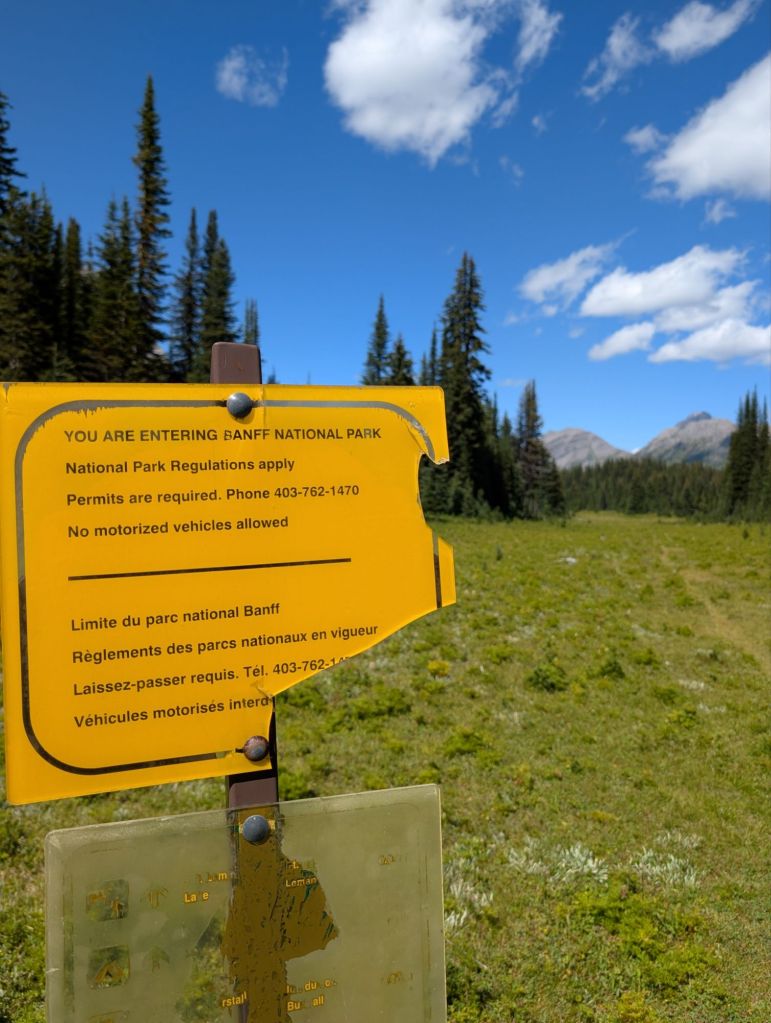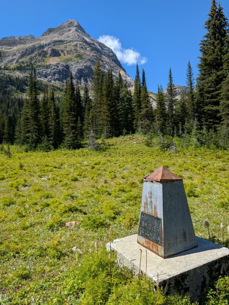 I rejoined the regular GDT after fording Leroy Creek. This is where the trail became much quieter and also of much worse quality. It was a gentle uphill slog tthrough very overgrown trail up to the last bit before Palliser Pass, which was much steeper and less overgrown. I never want to see another willow or black currant plant! I met three other nobos doing section C on my way up, but passed them and since they’re camping behind me, probably won’t see them again. The last bit of the climb up the pass was steep, so I took advantage of the wild blueberries and stopped every once in a while to eat a few and catch my breath. They’re bigger than the wild ones we get in Quebec, but also full of flavor. After Palliser Pass, it was quite flat for a while with more lakes. I arrived at the Alberta/BC border and crossed back into Alberta (I had crossed into BC shortly after starting off this morning) and into Banff National Park.